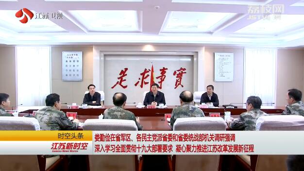 今天,省委书记娄勤俭到省军区、各民主党派省委和省委统战部机关走访调研,强调要站在党和国家事业发展大局的战略高度,深入学习、全面贯彻十九大提出的新部署新要求,在习近平新时代中国特色社会主义思想指引下,进一步凝聚各方面的智慧和力量,齐心协力、砥砺奋进,共同推进江苏改革发展新征程。