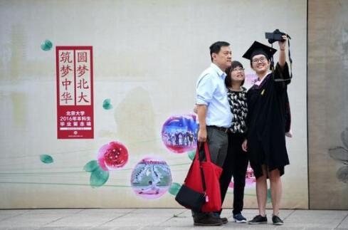 资料图片:一位北京大学毕业生在毕业典礼前与家人自拍留念(2016年7月5日摄)。新华社记者鞠焕宗 摄