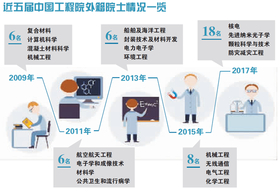 北京商报记者梳理发现,近年来当选的中国工程院外籍院士研究领域逐渐偏重微观科学,高精尖特点也愈发明显。2011年外籍院士研究领域包括航空航天工程、电子学和成像技术、材料学、公共卫生和流行病学等;2013年包括船舶及海洋工程、封装技术及材料开发、电力电子学、环境工程及化工等;2015年包括机械工程、无线通信等。而到了今年,当选外籍院士研究领域进一步延伸到先进纳米光子学、计算机分布式计算、核能电力等。