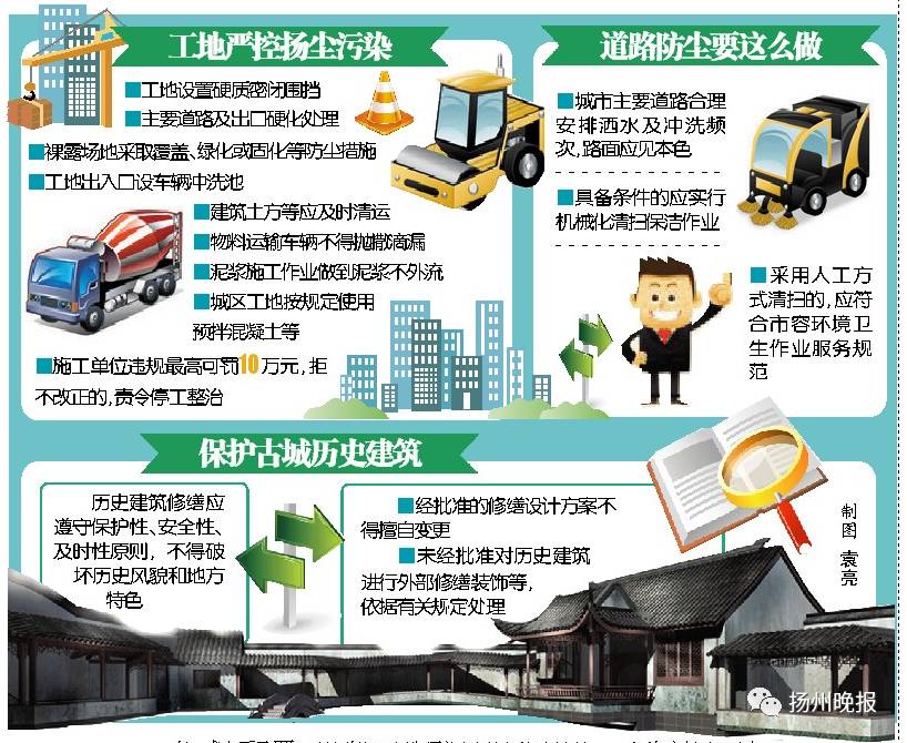 昨天,扬州市政府召开新闻发布会,先后发布两部地方法:《扬州市扬尘污染防治管理暂行办法》明年起施行,《扬州古城历史建筑修缮管理办法》本月起施行。