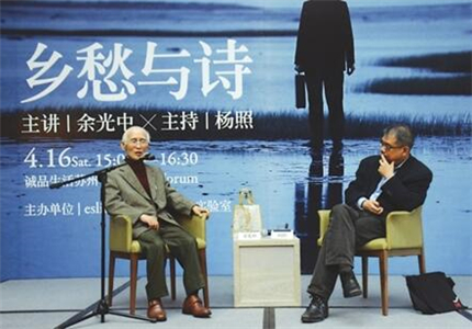 或许是我们对诗人了解得太少,也或许是我们对曾经的《乡愁》印象太深,总有人在知道诗人的“愁绪”为何之后,还想问“您的乡愁还在吗?”在整场讲座中,尽管题目是“乡愁与诗”,而他却避而不谈。“古往今来,乡愁一直都有且永远存在。从1992年开始,北京社科院请我回来讲座,二十多年来,我一年要回来七八次,‘乡愁’已经过去了,但它又一直存在。我老是回家,还讲‘乡愁’干嘛,我开始讲回乡。我写山东、写南京、写四川……写很多地方。”余光中说,现代社会变化太快了,信息铺天盖地,巨大的生活变迁让人们都失去了“故乡”,即便你回去,再也找不到过去的影子。“‘科技催未来快来’,然而,‘文化求历史慢走’,当然‘催’的力量远远大于‘求’的力量,我只想说,年轻人啊,你可以慢一点。喜欢写旧体诗,就去读读古诗,喜欢写现代诗,就去读读雪莱、泰戈尔,也可以读古诗,你不妨慢一点。”