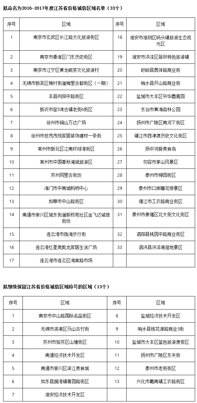 15日,包括南京秦淮区老门东景区、南京玄武区长江路文化旅游街区等在内46个购物消费区域在江苏省物价局官方网站上进行2016——2017年度江苏省价格诚信区域社会公示,公开征求社会各界的意见。据悉,江苏省价格诚信区域建设成为全国首创,具有引领和示范作用。到2020年,将建成全省价格信用管理信息平台,健全江苏省市场主体价格信用信息数据库,依托公共信用信息系统,实现与相关部门的信用信息互联互通和交换共享。