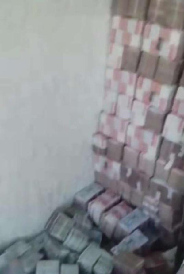 被砸开的墙壁之中出现摞得一人多高的人民币。
