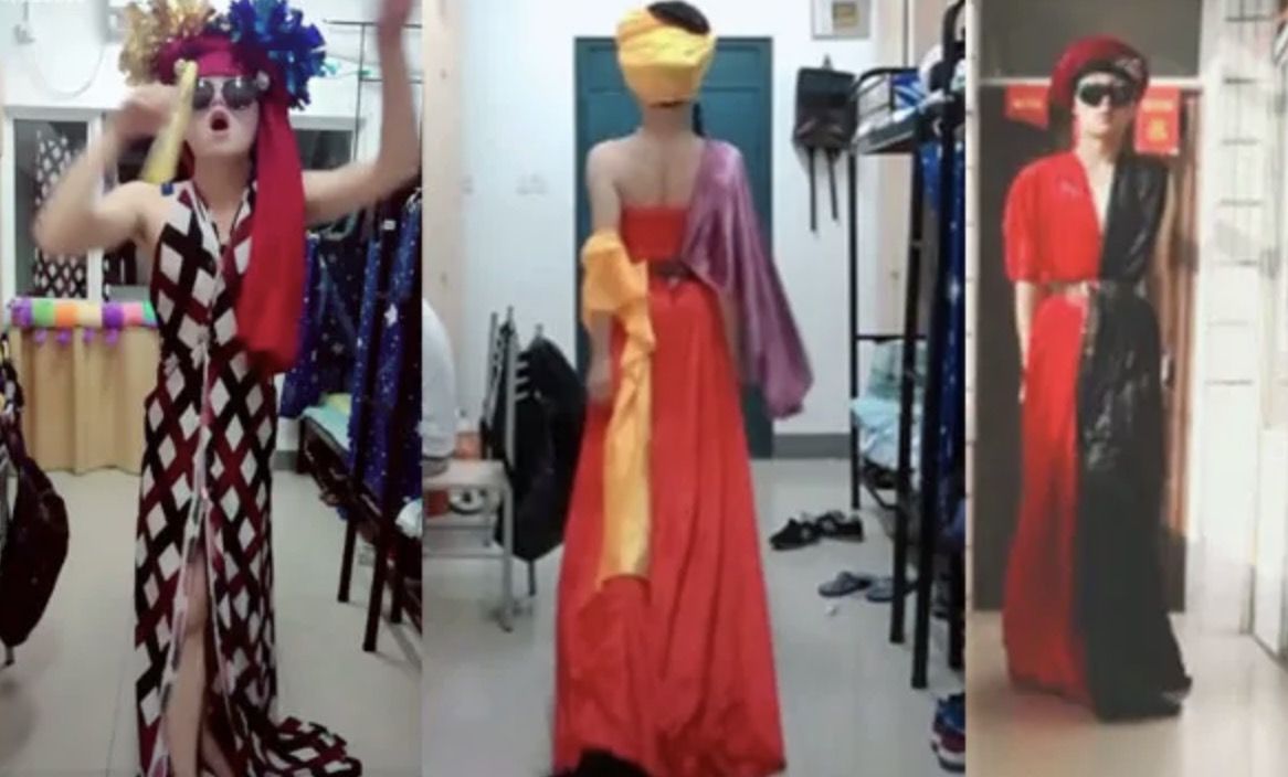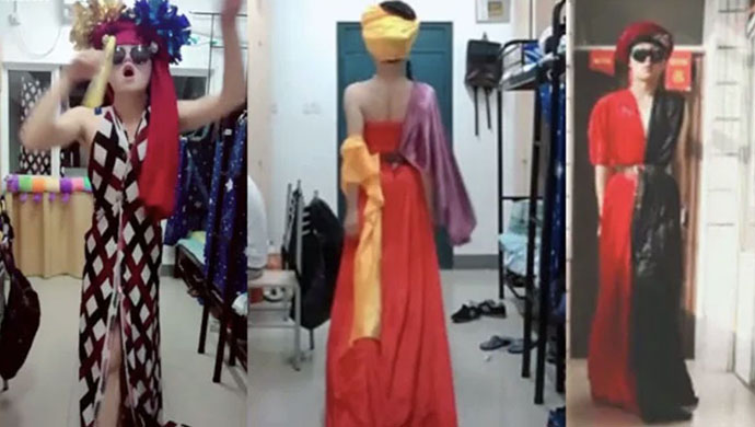 昨天,一段“窗帘改成礼服,工科男寝室走秀”的短视频登上微博热搜。短短两分钟的视频,主角换了几套风格各异、色彩明艳的礼服,配上夸张的头饰,把寝室当成T台,伴着音乐自信地走起秀来。