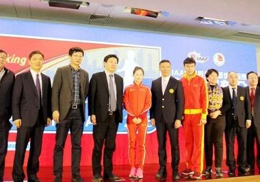 Representatives from the Chinese Athletics Association, China's General Administration of Sport and the Wuxi municipal government pose for a group photo after the press conference. [Photo/WeChat account: taicangdaily]