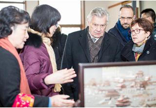 The delegation first visited the Wuxi Folk Art Museum, in which traditional cultural heritages of Wuxi are exhibited, including Huishan clay figurines, Wuxi embroidery and Liuqing bamboo works. The craftsmen of each traditional cultural heritage also have studios there, attracting the delegations members' interest.
