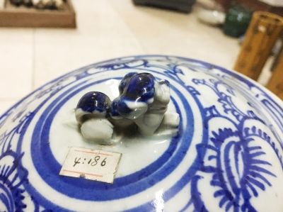 而在宝应博物馆的库房里,清代青花花卉瓷罐盖中间的钮有些特别,一看,原来这个钮是一只憨态可掬的小狗造型。工作人员告诉记者,如今,这件清代青花花卉瓷罐仅剩上面的盖子。青花花卉瓷罐盖直径20厘米,一只可爱的小狗抬着头趴在青花花卉瓷罐盖中间卖萌,小狗的头部、耳朵、正身和尾巴都采用了青花点缀,刚好装饰了狗狗身上的斑纹,也和四周的青花花卉相得益彰,搭配得如此巧妙,可能当初青花花卉瓷罐不仅是一件实用器,也是一件精美的装饰品。