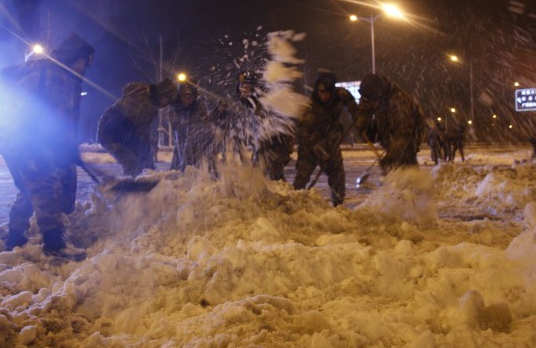 凌晨4点,记者赶到江苏大剧院的时候,70连的战士们已经投入到了紧张的铲雪“战斗”中了。