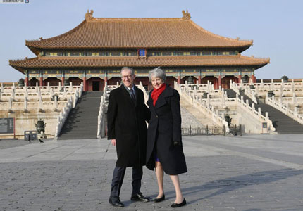 由于这次访问正值传统佳节春节前夕,特雷莎·梅在一次欢迎仪式上为狮子点睛。而在参观故宫的留影中,特雷·莎梅系着红色围巾,穿着丝袜平底鞋,在北京蓝色天空和宏伟宫殿的背景下,首相夫妇显得非常开心。