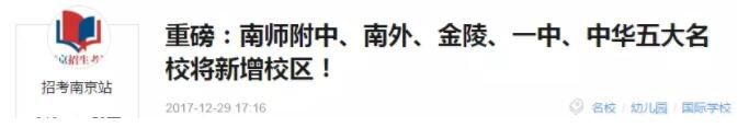 In the coming five years from 2018 to 2023, new campuses of Nanjing Foreign Language School,High School Affiliated To Nanjing Normal University,Jinling High School,Zhong Hua Middle School and Nanjing No.1 Middle School will land in the Jiangbei New District, the Hexi New Town, the Southern New Town, Yanziji New Town of Qixia District and the Yuhua Bridges Area. High quality educational mechanisms will be introduced into the newly constructed campuses.
