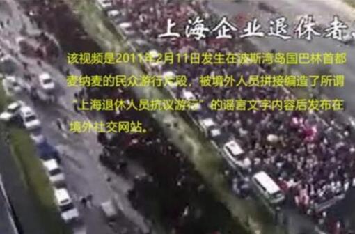 @警民直通车-上海 官方微博2月3日消息,近日,互联网上有两段所谓“上海企业退休人员游行抗议”的视频在传播,上海市公安局立即会同内蒙古自治区、辽宁省公安机关查明:该视频是2011年2月11日发生在波斯湾岛国巴林首都麦纳麦的民众游行片段,被境外人员拼接编造了所谓“上海退休人员抗议游行”的谣言文字内容后发布在境外社交网站。刘某(男,63岁,内蒙古人)和王某(男,57岁,辽宁人)在未核实内容真实性的情况下又将视频发布在微信群中传播,混淆视听。目前,传播不实信息的刘某和王某已分别被当地公安机关依法处罚。