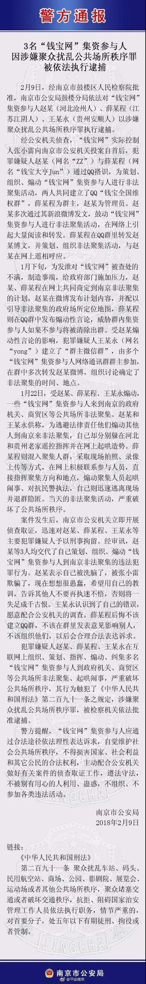 据@平安南京,3名“钱宝网”集资参与人因涉嫌聚众扰乱公共场所秩序罪被依法执行逮捕,警方通报如下。