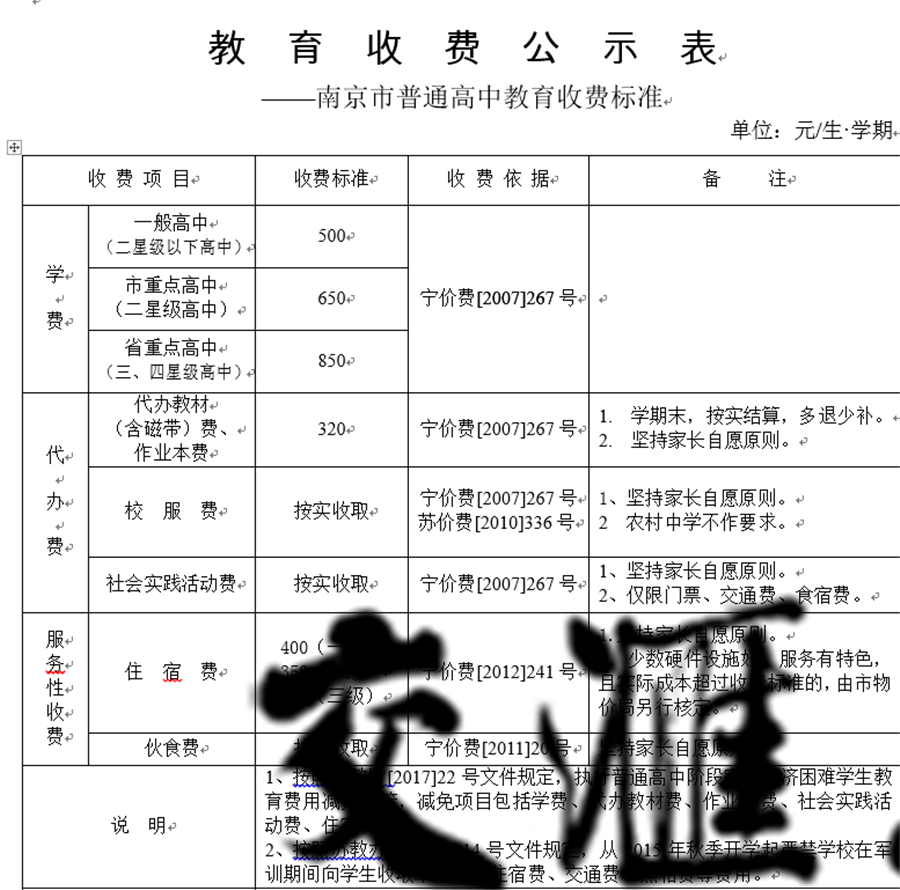 根据2018年春季学期教育收费公示表显示,南京市普通高中教育收费标准为:一般高中学费500元/生•学期,市重点高中650元/生•学期,省重点高中850元/生•学期;