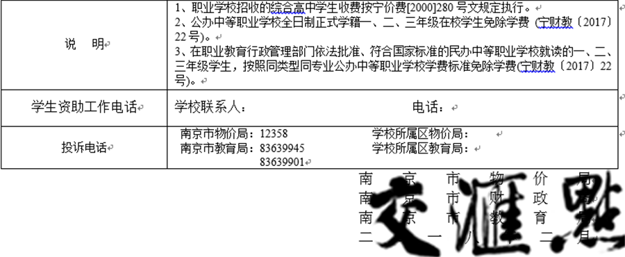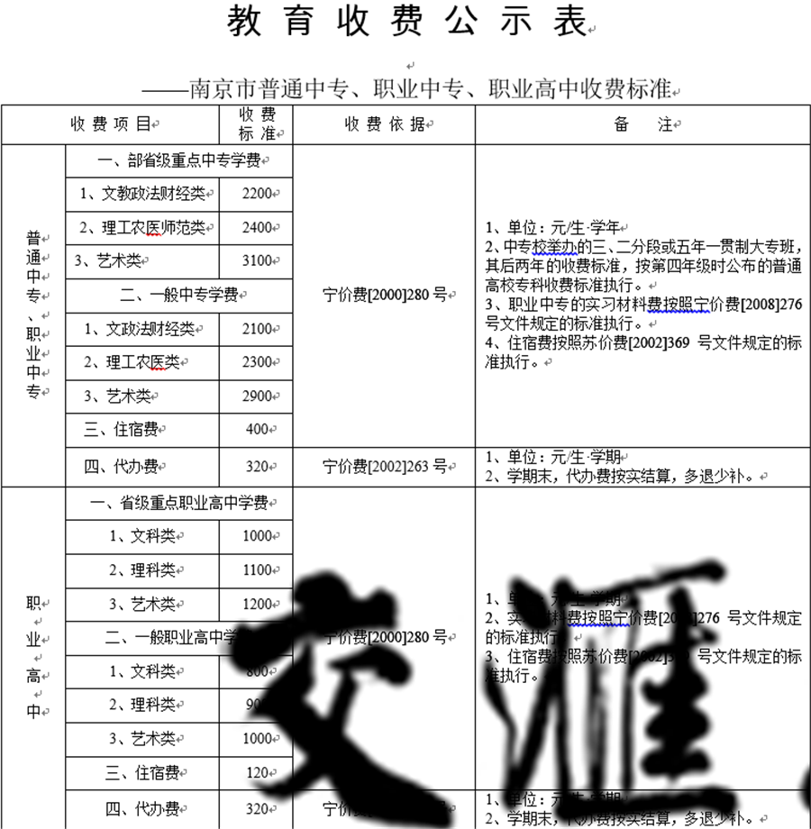 南京市普通中专、职业中专、职业高中收费标准为:部省级重点中专文教政法财经类学费为2200元/生•学年,理工农医师范类2400元/生•学年,艺术类3100元/生•学年;一般中专文政法财经类学费2100元/生•学年,理工农医类2300元/生•学年,艺术类2900元/生•学年;省级重点职业高中文科类学费1000元/生•学期,理科类1100元/生•学期,艺术类1200元/生•学期;一般职业高中文科类学费800元/生•学期,理科类900元/生•学期,艺术类1000元/生•学期。