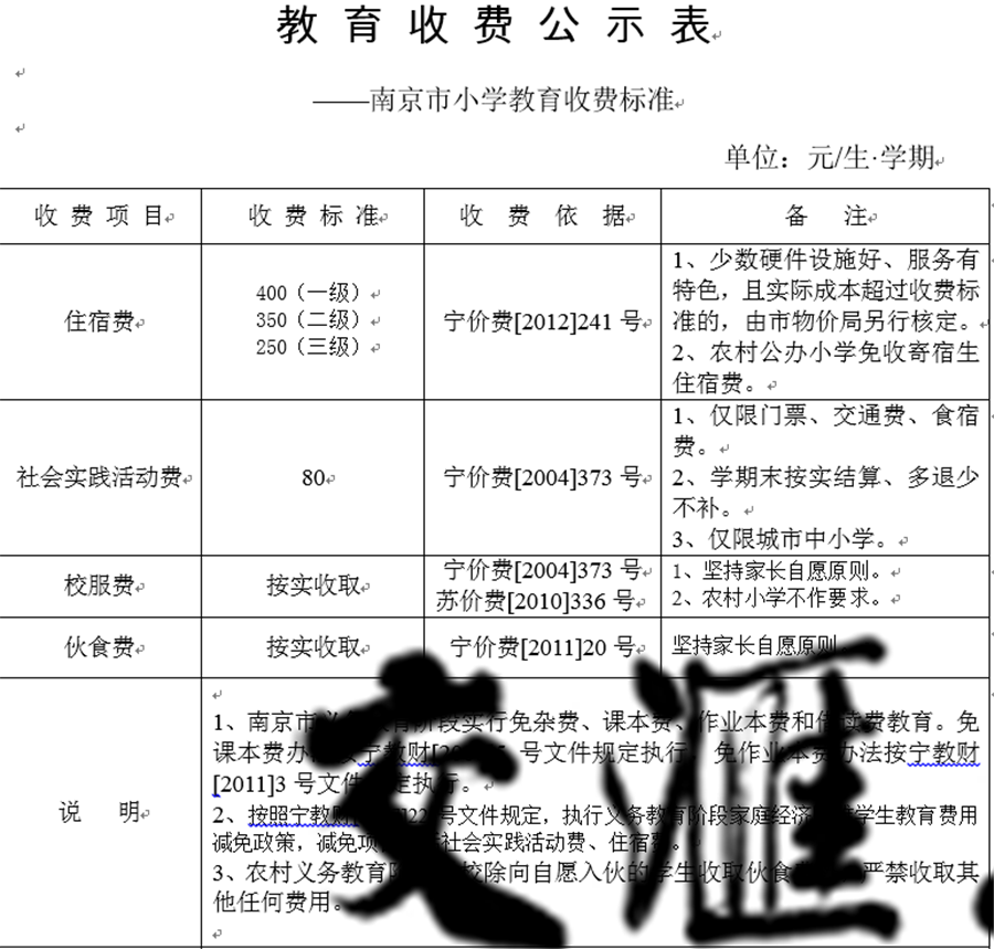 此外,南京农村公办小学初中免收寄宿生住宿费,其他小学初中住宿费收费标准为400(一级)元/生•学期,350(二级)元/生•学期,250(三级)元/生•学期。