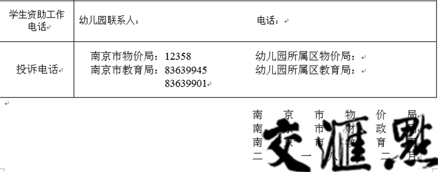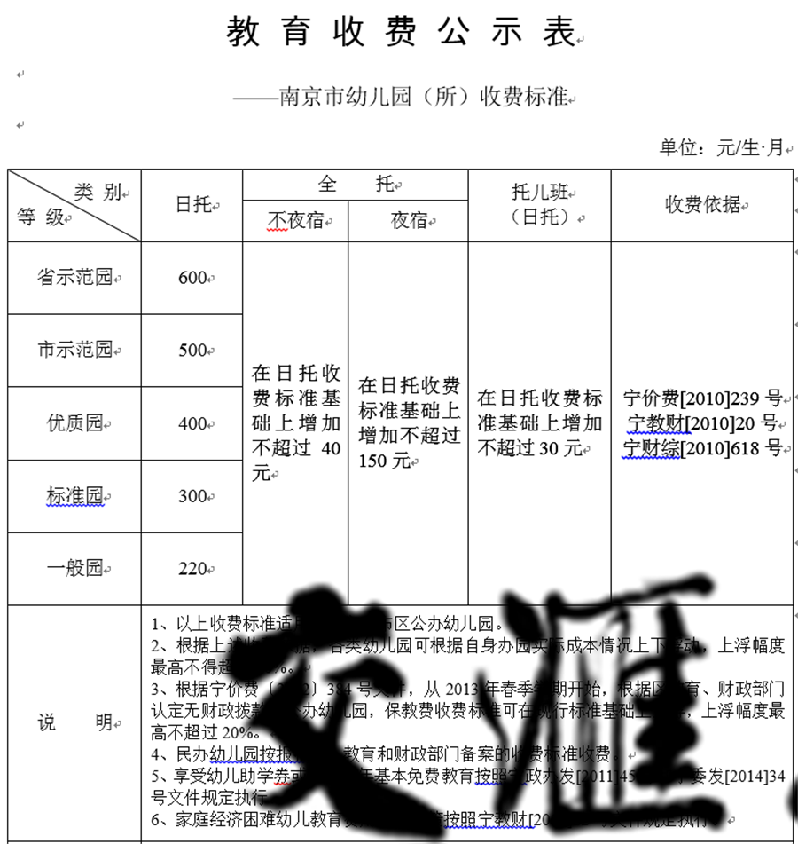 南京市幼儿园(所)收费标准为日托省示范园600元/生•月,日托市示范园500元/生•月,日托优质园400元/生•月,日托标准园300元/生•月,日托一般园220元/生•月。同时,全托不夜宿的在日托收费标准基础上增加不超过40元,全托夜宿的在日托收费标准基础上增加不超过150元,日托托儿班在日托收费标准基础上增加不超过30元。