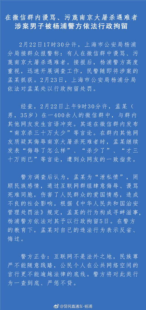 2月22日17时30分许,上海市公安局杨浦分局接群众报警称:有人在微信群中谩骂、污蔑南京大屠杀遇难者。接报后,杨浦警方高度重视,迅速开展调查工作,民警随即将涉案的孟某抓获。2月23日,上海市公安局杨浦分局依法对孟某处以行政拘留处罚。