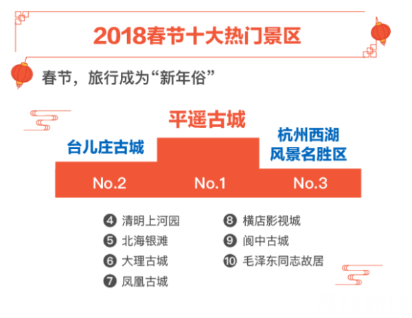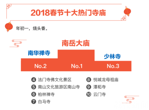 数据显示,2018年春节前夕驾车去往广州塔、磁器口、凤凰古城的导航用户最高,节中去往平遥古镇、台儿庄古城、杭州西湖风景名胜区的导航用户最高。而年初一到年初三,衡阳南岳大庙、韶关南华禅寺、郑州少林寺成为热门祈福寺庙前三甲。
