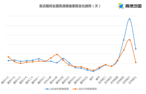报告显示,通过对比分析腊月十六至正月初七与2017年同期的数据来看,虽然2018年全国高速平均拥堵里程比去年有所增长,但2018年与去年相比节前总体出行较为分散、拥堵峰值不明显,未出现去年小年拥堵集中的现象。