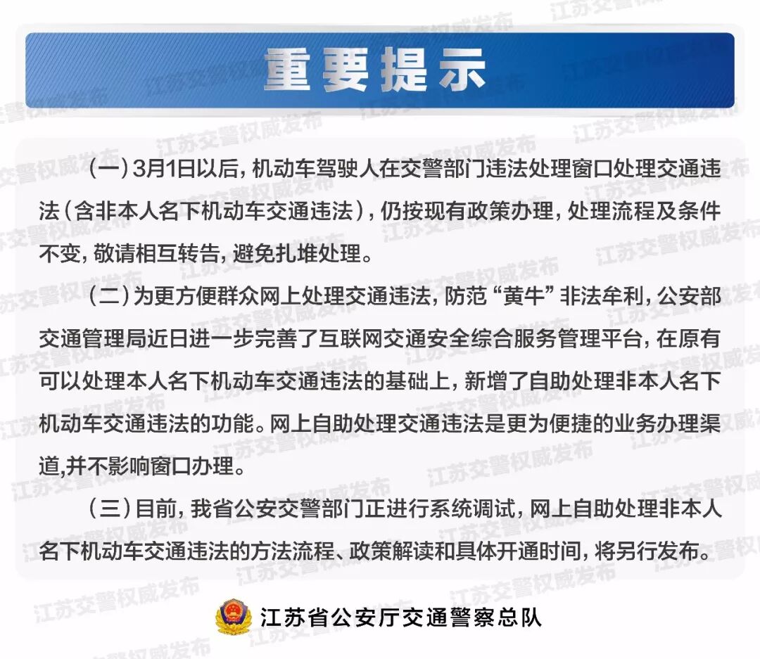 据江苏省公安厅交通警察总队,3月1日后,机动车驾驶人在交警部门违法处理窗口处理交通违法(含非本人名下机动车交通违法),仍按现有政策办理!