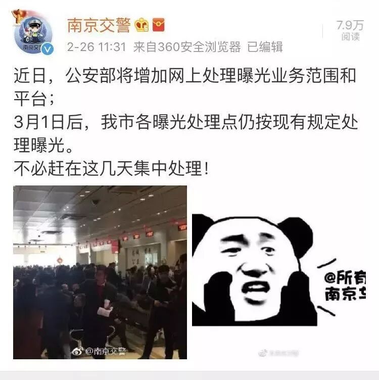 据@南京交警 今天上午发布消息,近日公安部将增加网上处理曝光业务范围和平台,3月1日后,南京市各曝光处理点仍按现有规定处理曝光,不必赶在这几天集中处理!