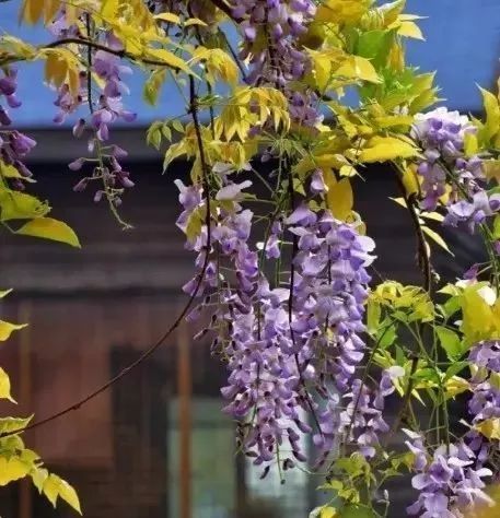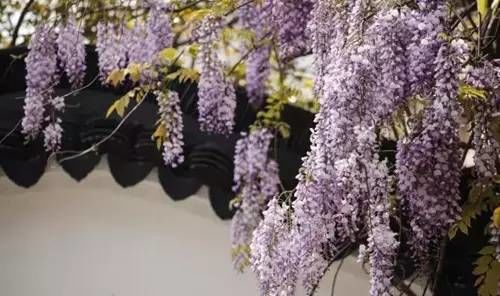 在灰瓦白墙间,苍劲的紫藤巍然静卧,虽历经千载,仍花繁叶茂。一大片的紫藤花垂下来,细碎的花瓣随风摇曳,美不胜收。