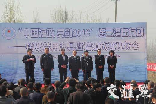3月28日,由连云港市海洋与渔业综合行政执法支队主办,灌云县海洋与渔业局协办的“中国渔政 亮剑2018”连云港在行动——销毁禁用渔具暨增殖放流现场会在灌云县举行。