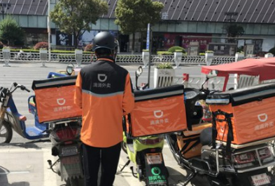 △穿着美团外卖衣服的骑手后面装着滴滴外卖箱