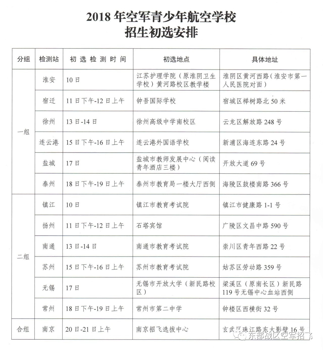 4月4日,记者从南京招飞选拔中心获悉,江苏省13个设区市将于4月10日—4月21日组织2018年空军青少年航空学校招生初选检测。据了解,江苏省依托南京师范大学附属中学和南通中学开办空军青少年航空实验班,2018年南师附中计划招收40名学生,南通中学计划招收50名学生。(具体安排见下表)