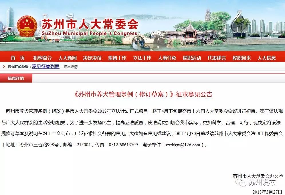 目前《苏州市养犬管理条例(修订草案)》正在征求意见中,大家如有意见或建议,请于4月30日前反馈苏州市人大常委会法制工作委员会。