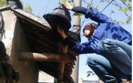 只见他拿出笼子,将一个近乎于排球大小的一窝中华野生蜂慢慢收进笼子里。张师傅努力了半个小时才清完。就在此时,二畔铺103号门口的树上也来了一窝中华野生蜂,张师傅立刻赶到,将蜂王收笼子里训养。