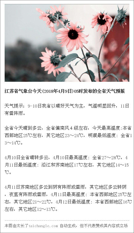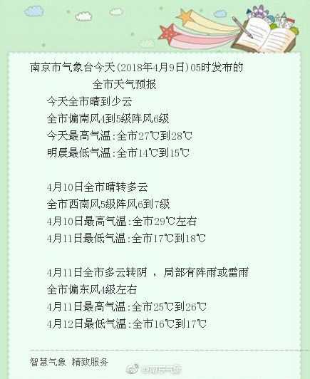 据@江苏气象官方微博,9-10日我省以晴好天气为主,全省今天晴到多云,全省偏南风4级左右,今天最高温度:本省西部地区25℃左右,其它地区23~24℃,明晨最低温度: 全省13~14℃。