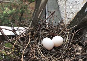 4月4日,宋先生发现窗台上的鸟巢多了一些新枝,还有两个洁白的鸟蛋。原来,斑鸠夫妻又回来了。
