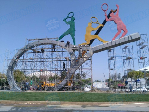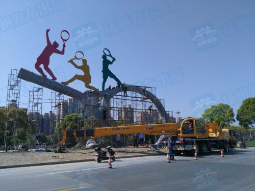 这一“网球拍”造型雕塑,高13.8米,长24.8米,面积达300多平米。如此大的网球拍雕塑,全国少见,将成为扬州体育公园的新景观。