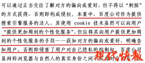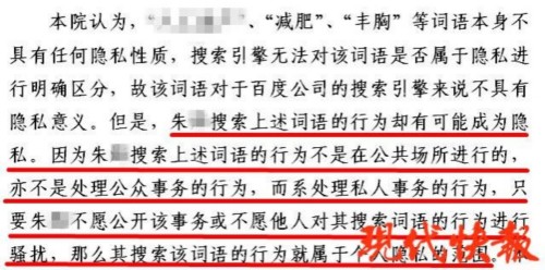 南京鼓楼法院认为,"减肥""隆胸"等词语本身不具有隐私性质,但是朱女士不是在公共场所进行搜索的,不是处理公务,是想处理私事,只要她不愿意公开或不愿他人对其搜索词语的行为进行骚扰,那么其搜索该词语的行为就属于个人隐私范围。本案中,百度公司作为提供搜索引擎服务的法人,其使用 cookie 技术虽然可以向用户"提供更加周到的个性化服务",但应当明确告知用户,否则即侵害了用户对自己隐私的控制权。