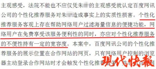 判决书指出,百度个性化推荐服务并未识别出用户的真实身份,其收集和推送的信息终端是浏览器。虽然百度利用跟踪技术提供了个性化推送服务,但其并未直接向合作方披露用户信息。因此,这类上网轨迹不属于个人信息范畴。既然不是个人信息,也就更谈不上隐私。另外,个性化推荐服务具有协助互联网用户过滤海量信息的功能,用户在享受免费且便捷服务的同时,应对该项技术持一定的宽容度。朱女士的起诉被驳回。