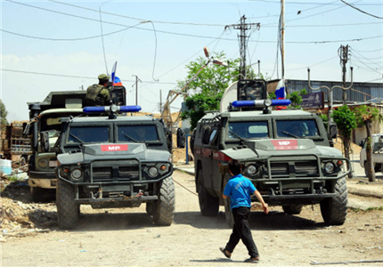 杜马镇,一名儿童从两辆俄罗斯武装警察车辆前走过。新华社发(阿马尔摄)