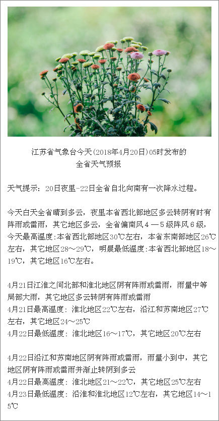 江苏双休日的降温还不算明显,都维持在20℃以上。以南京为例,下雨后,后天最高气温预计下降到26℃到27℃。不过,4月23日起,最高气温可能跌至20℃以下,提醒大家及时增减衣物。