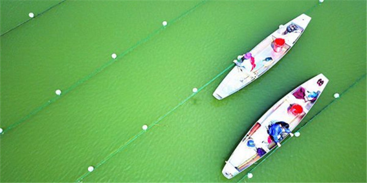 4月19日,工人对水库中养殖的河蚌进行管理。轻舟绿水,构成一幅优美水上“春耕”图。