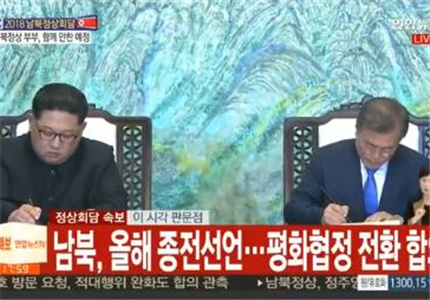 此前,韩国青瓦台发言人金宜谦27日在设于京畿道韩国国际展览中心(KINTEX)的韩朝首脑会谈主新闻中心(MPC)表示,韩国总统文在寅和朝鲜最高领导人金正恩将在当天下午的首脑会谈结束后签署协议并共同发表。