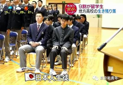 因此,为了留住留学生,面对日本高考的应试教育,这些高中的升学率甚至达到了100%。这样不但能够保证成绩,还确保了留学生的生源,让一些濒临破产学校的经营得到了稳定发展。例如宫崎县虾野市的这所高中,中国学生比例很高,开学典礼上集体唱中国国歌,校长用中文讲话。
