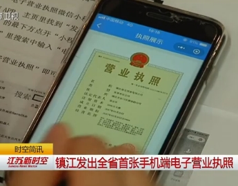 近日,镇江市工商局发出全省首张手机端电子营业执照,该电子营业执照与纸质营业执照具有同等法律效力,可在生意来往、银行开户、执法检查等活动中通过手机在线查看、出示、打印,并具备防伪、防篡改等信息安全保障特性。(江苏广电融媒体新闻中心记者/周杨杨 镇江台/岳宇澄)