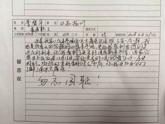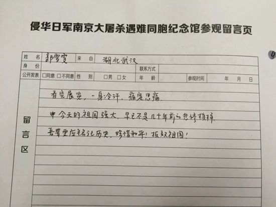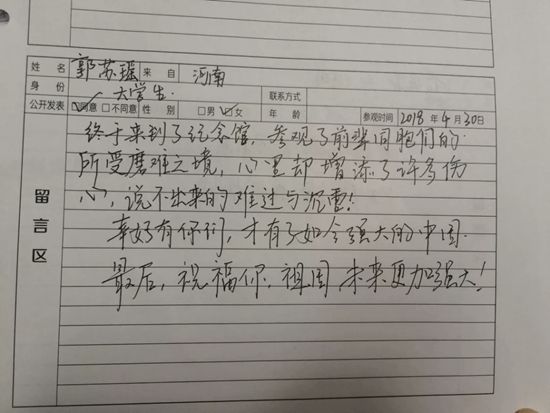 在纪念馆史料陈列厅的尾厅,有专门的观众留言区。大家可以把参观后的感言留在上面。“五一”小长假三天,工作人员几乎每天都要更换6支笔芯、两本留言簿。很多观众的留言令我们感动。 一起来看: