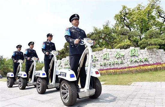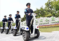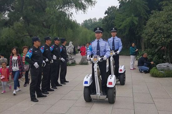 新型巡逻工具——警用平衡车,外形时尚、低碳环保,与周围景区环境融为一体。该车驾驶方便,可随时随地“招手停”,极大的满足了游客的求助愿望。