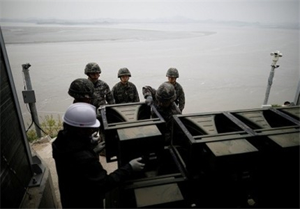 韩军士兵1日拆除非军事区附近的对朝扩音喊话设备(路透社)