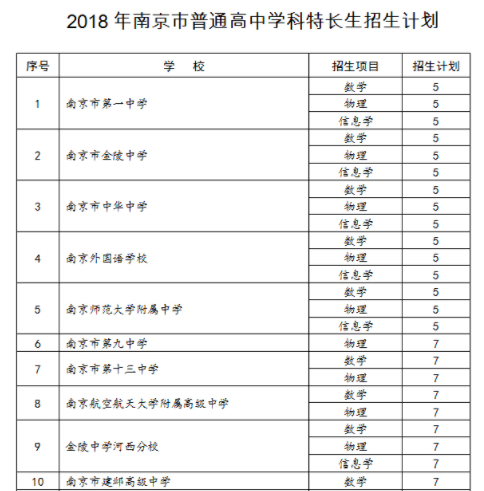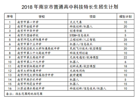 南京市教育局近日公布普通高中科技和学科特长生招生计划。我苏网了解到,2018年,南京招收科技特长生的普通高中有16所,涵盖项目包括天文气象、科技创新、创意传媒等;此外,招收学科特长生的普通高中达21所,招生项目包括数学、物理、化学、信息学等。