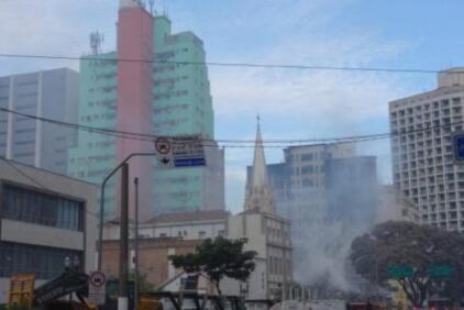 资料图:当地时间5月1日凌晨1时30分左右,巴西圣保罗市中心拉戈德派桑杜(Largo do Paissandu)广场附近的一幢24层废弃公寓楼发生火灾后坍塌。图为当天下午坍塌公寓楼废墟上还冒着白烟。 中新社记者 莫成雄 摄
