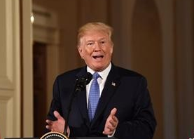 资料图:当地时间4月27日,美国总统特朗普在白宫会见来访的德国总理默克尔,并共同会见记者。图为特朗普出席联合记者会。中新社记者 刁海洋 摄