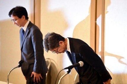 2017年10月20日,在日本东京,日本神户制钢所(神钢)副社长梅原尚人(右)就其下属子公司篡改产品数据问题鞠躬致歉。 新华社记者马平摄
