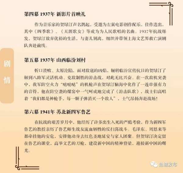 歌剧《贺绿汀》共六幕,分别表现贺绿汀投身革命、赴国立音专(上海音乐学院前身)深造、刻苦钻研西洋乐理和演奏技艺、组织带领上海文艺界救亡演剧队奔赴前线、在“哒哒哒”的机枪声中创作出《游击队歌》、在鲁迅艺术学院任教的人生历程。演职人员的精彩表演,激起全场观众阵阵热烈的掌声。